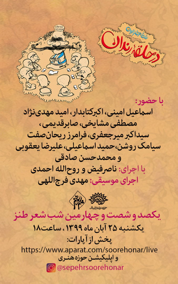 به گزارش روابط عمومی دفتر طنز حوزه هنری برای پیشگیری از شیوع بیشتر ویروس کرونا؛ 164اُمین شب شعر طنز در حلقه رندان یکشنبه 25 آبانماه 1399 ساعت 18 به صورت آنلاین و از طریق سایت آپارات پخش خواهد شد.