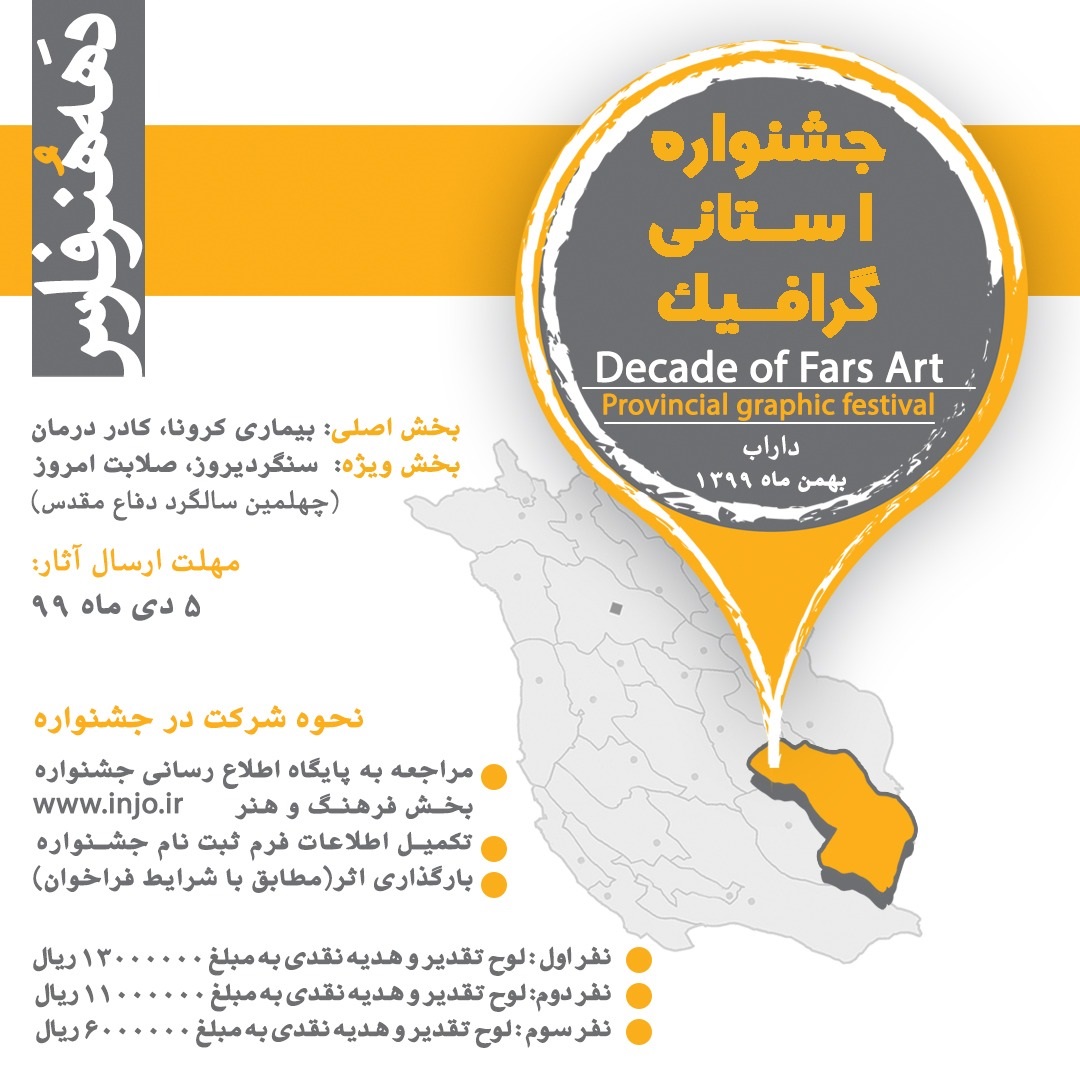 به گزارش روابط عمومی مرکز تجسمی حوزه هنری، جشنواره استانی گرافیک در بهمن ماه 1399 در داراب برگزار می شود. این جشنواره که به طور مجازی برگزار خواهد شد در ده رشته متفاوت برگزار می شود که هر رشته  شامل دو بخش اصلی با موضوع کرونا، کادر درمان و بخش ویژه با موضوع سنگر دیروز، صلابت امروز (چهلمین سالگرد دفاع مقدس) است.