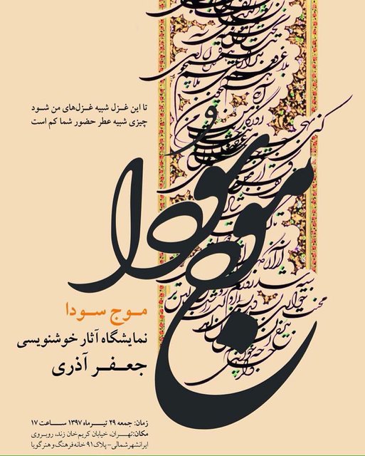 به گزارش روابط عمومی مرکز تجسمی حوزه هنری، جعفر آذری، هنرمند خوشنویس درباره نمایشگاهش که «موج سودا» نام دارد، توضیح داد: در این نمایشگاه ۳۰ قاب، اثر خوشنویسی شکسته نستعلیق ارائه شده که در آنها از اشعار شعرای مختلف استفاده کردم، از شعرای حال حاضر میتوانم به استادان محمدرضا شفیعی کدکنی، هوشنگ ابتهاج، محمدعلی بهمنی و از قدما به خیام، حافظ، سعدی، مولانا و تکبیتهای صائب تبریزی و گاه بیدل دهلوی اشاره کنم.